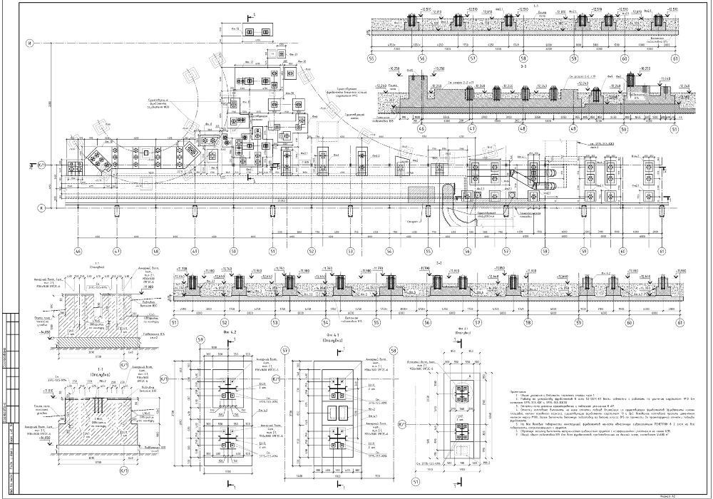 Проектирование железобетонного стенового фундамента со стальным каркасом под 2 горизонтальных грохота; железобетонного фундаменты под шаровые мельницы, мельницы самоизмельчения производительностью 1450 т/ч; железобетонного стенового фундамента под 2 конусные дробилки производительностью 1850 т/ч и вспомогательное оборудование.